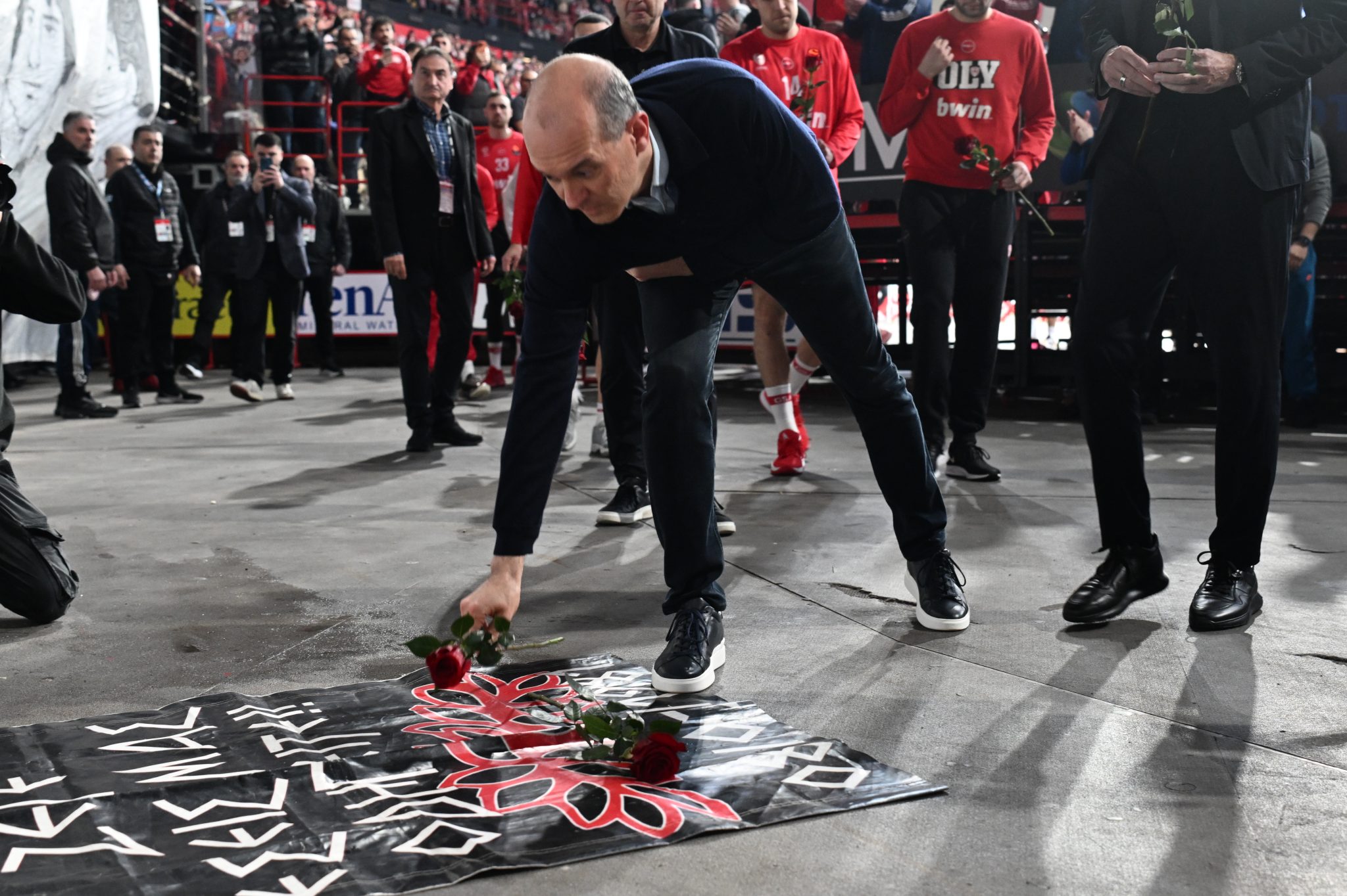 Συγκινητικές στιγμές εκτυλίχθηκαν στο ΣΕΦ, καθώς λίγο πριν το τζάμπολ στο Ολυμπιακός – Βίρτους Μπολόνια, οι παίκτες των Ερυθρόλευκων, ο Ντάνιελ Χάκετ, καθώς και οι αδερφοί Αγγελόπουλοι κατέθεσαν στεφάνια στη μνήμη των θυμάτων της τραγωδίας της θύρας 7.