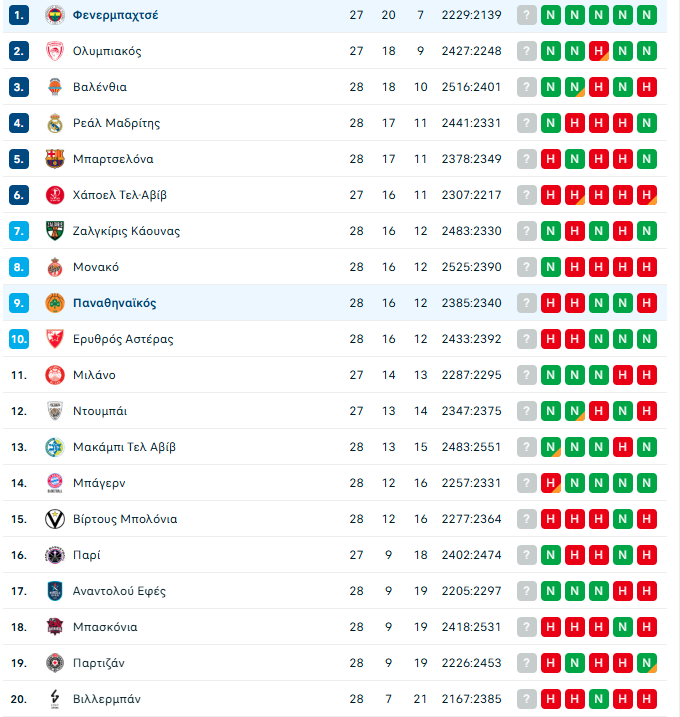 O Παναθηναϊκός ηττήθηκε από την Φενέρμπαχτσε στο ΟΑΚΑ με 85-83, χάρη στο τρομερό buzzer beater του Μπόλντγουιν για την 28η αγωνιστική και έριξε το ρεκόρ του στο 16-12 και βρίσκεται στην 7η θέση της κατάταξης.