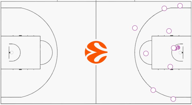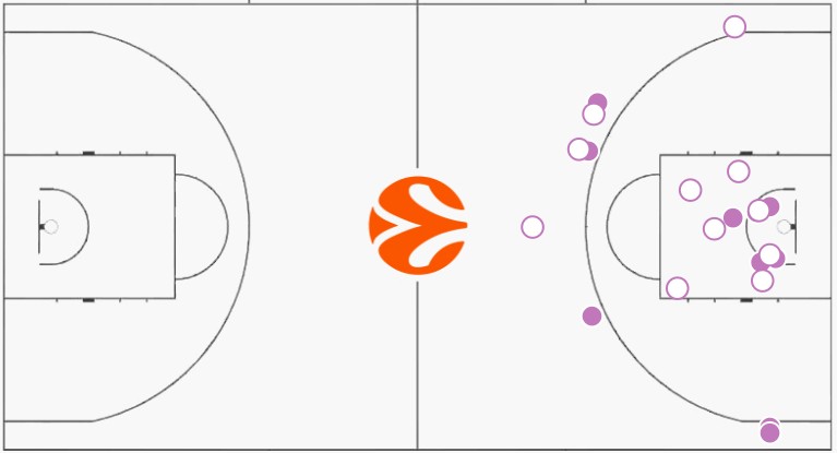 Το Shot Chart του Εβάν Φουρνιέ (με μωβ τα εύστοχα, με λευκό τα άστοχα).
