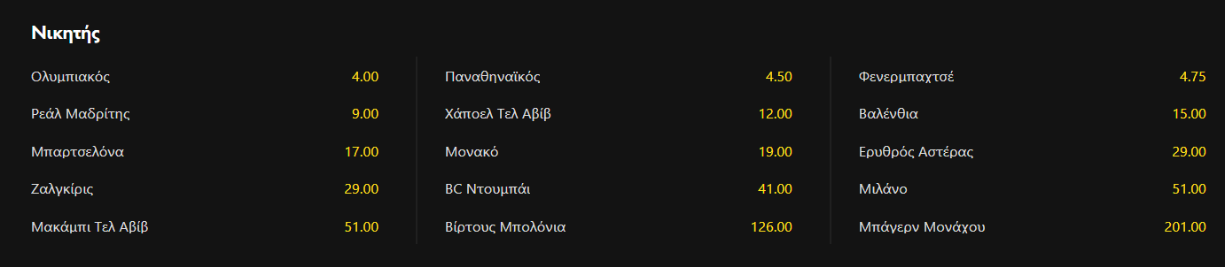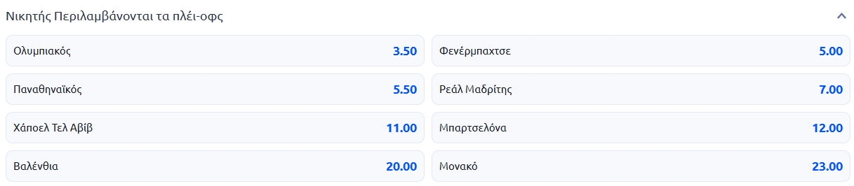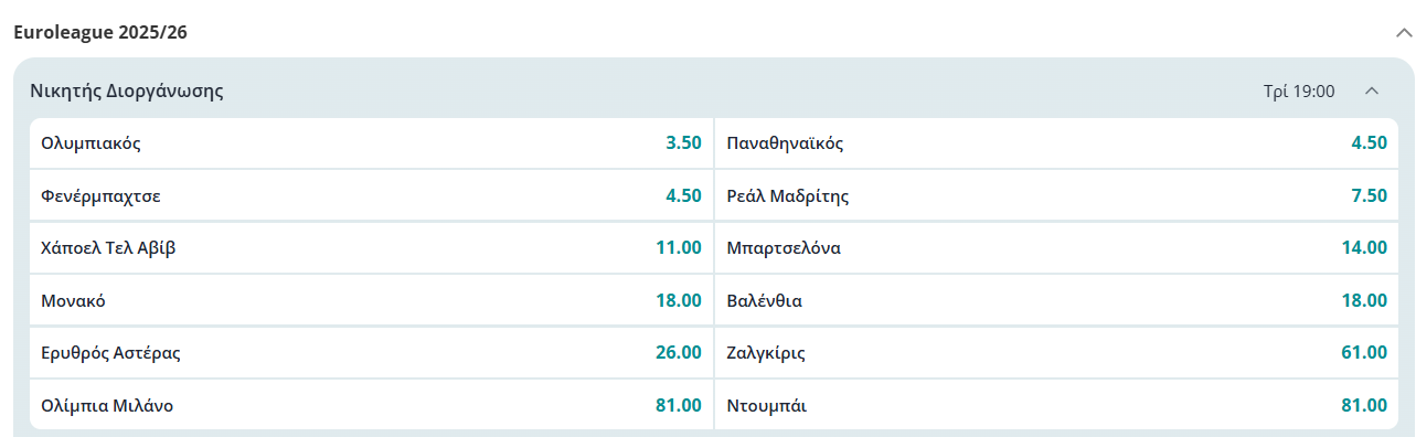 Από εκεί και πέρα, ο Ολυμπιακός είναι σταθερά στην 1η θέση για να κατακτήσει τη Euroleague μέσα στο ΟΑΚΑ, με αποδόσεις πάρα πολύ χαμηλές, ενώ κατά βάση ακολουθεί η Φενέρ κι εν συνεχεία ο Παναθηναϊκός. Ο οποίος όμως «παίζει» τη ζωή του στα δύο επόμενα εκτός έδρας ματς στη Euroleague με Ολυμπιακό και Ντουμπάι.