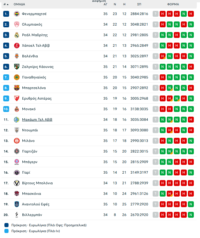 Αναλυτικά η βαθμολογία της Euroleague και η θέση που είναι ο Ολυμπιακός