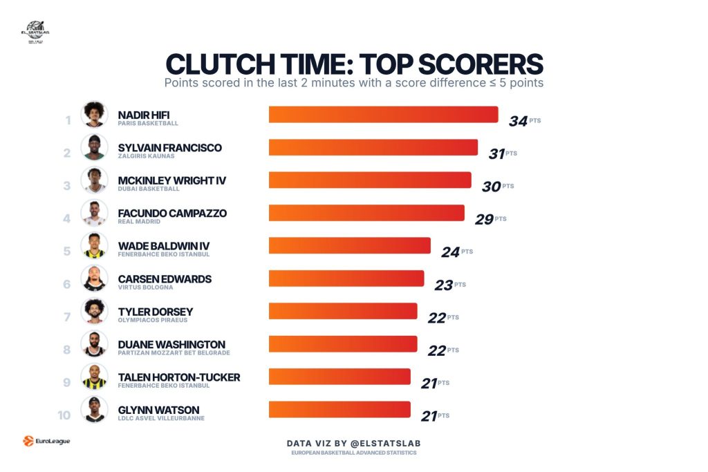 Μια πολύ ενδιαφέρουσα λίστα με τους κορυφαίους clutch scorers της φετινής Euroleague δημοσίευσε το «EL StatsLab». Η λίστα δημιουργήθηκε με βάση τους πόντους που σημειώθηκαν στα τελευταία δύο λεπτά, σε αγώνες στους οποίους οι δύο ομάδες είχαν διαφορά έως πέντε πόντους.