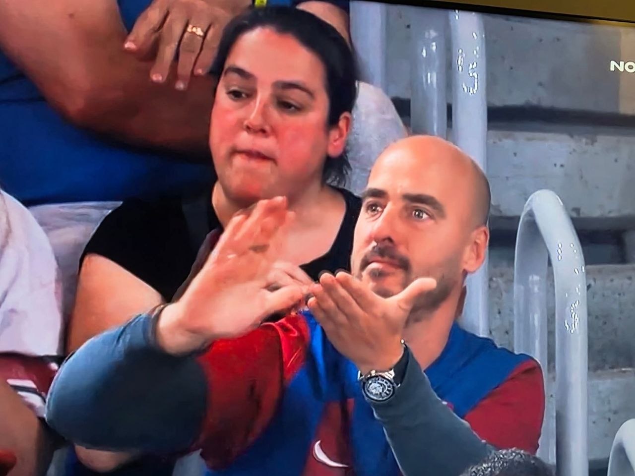 Όπως έδειξαν και οι κάμερες, ο κόσμος της Μπαρτσελόνα τα έβαλε με τους διαιτητές της αναμέτρησης, με εκατοντάδες να διαμαρτύρονται με χειρονομίες για τις αποφάσεις των ρέφερι υπέρ του Παναθηναϊκού. Στις φωτογραφίες παρακάτω, ένας φίλαθλος των μπλαουγκράνα κάνει τη χειρονομία των χρημάτων κατά των διαιτητών, όπως συνέβη και με δεκάδες άλλους οπαδούς των Καταλανών.
