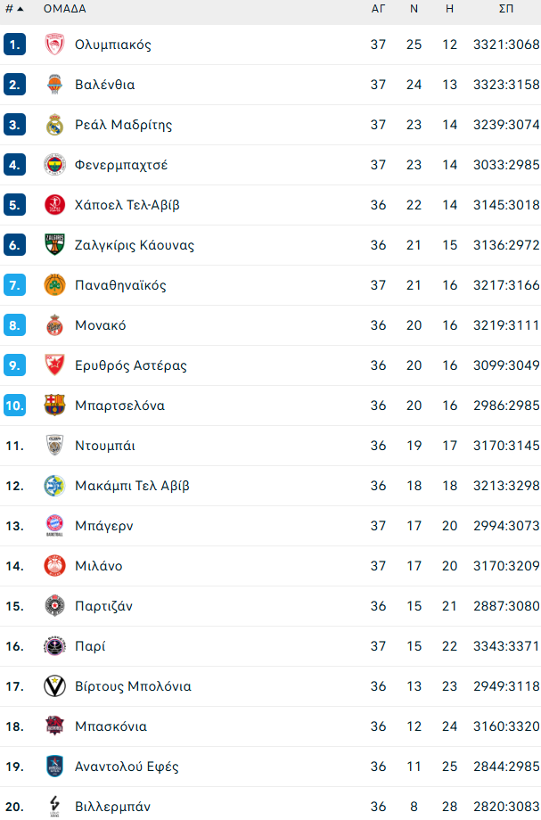Δείτε πώς διαμορφώθηκε η βαθμολογία της Euroleague μετά τη νίκη του Ολυμπιακού στη Σόφια και την ήττα του Παναθηναϊκού στη Βαλένθια