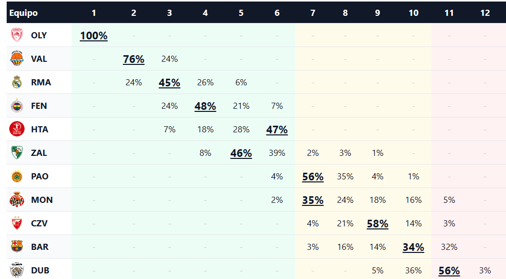 Από εκεί και πέρα για να βρεθεί στην 6η θέση συγκεντρώνει μόλις 4% πιθανότητες διότι εξαρτάται από τις Ζαλγκίρις και Χάποελ, που έχει μεν τις ισοβαθμίες, αλλά πλέον έχουν καλύτερο ρεκόρ.