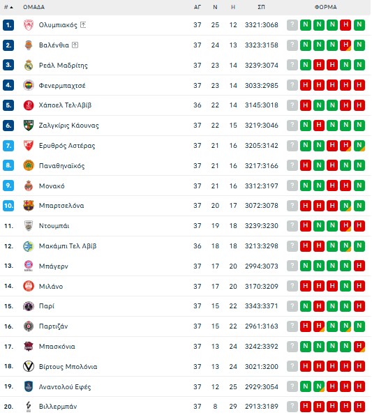 Πέντε αναμετρήσεις περιλάμβανε το σημερινό πρόγραμμα της Euroleague με το οποίο κλείνει η 37η αγωνιστική της διοργάνωσης, με τις μάχες για το καλύτερο δυνατό πλασάρισμα να συνεχίζονται.