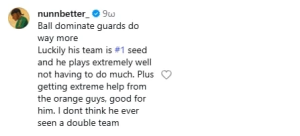 «Όλοι οι κυριαρχικοί guards κάνουν πολλά περισσότερα. Ευτυχώς η ομάδα του είναι στο νούμερο 1 και αυτός παίζει εξαιρετικά χωρίς να χρειάζεται να κάνει πολλά. Επίσης παίρνει τρομερή βοήθεια από τους “πορτοκαλί”, καλό γι’ αυτόν. Δεν νομίζω ότι έχει δει ποτέ double team», έγραψε ο Ναν μέσω του προσωπικού του λογαριασμού στο Instagram.