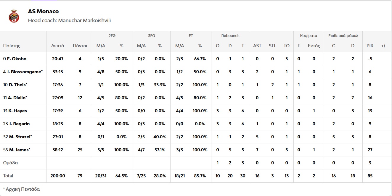 Αξίζει να σημειωθεί ότι ειδικά στο α’ μέρος ο Τζέιμς ήταν μια… Μονακό μόνος του, έχοντας τους 15 πόντους (3/3 δίποντα, 2/3 τρίποντα, 3/3 βολές, 3ασ., 3ριμπ., 4λ.) από τους συνολικά 34 της ομάδας του (7/16διπ., 3/12τρ., 11/13β., 9-5ριμπ., 4ασ., 8λ.).