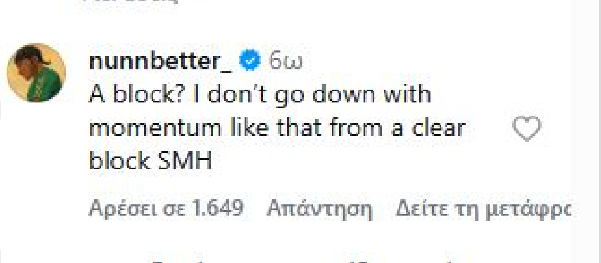 Ωστόσο, ο Αμερικανός γκαρντ του Παναθηναϊκού σχολίασε κάτω από το ποστ, εκφράζοντας την διαφωνία του για την φάση, υποστηρίζοντας πως του έγινε φάουλ.