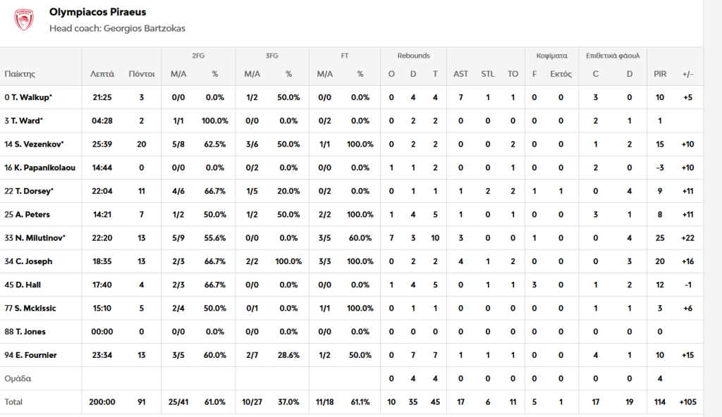 Όπως μπορεί να δει κανείς και στον πίνακα παρακάτω, ο Ολυμπιακός έχει τρομερό βάθος, έχει εξαιρετικούς παίκτες σε όλες τις θέσεις, που μπορούν να κάνουν τη διαφορά, όπως συνέβη και με τον Τζόσεφ, που η παρουσία του ήταν καταπληκτική όσο αγωνίστηκε.