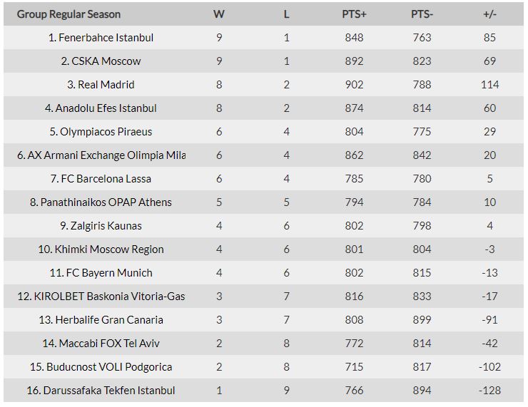 Αναλυτικά ο βαθμολογικός πίνακας με την 10η αγωνιστική της Euroleague συμπληρωμένη: