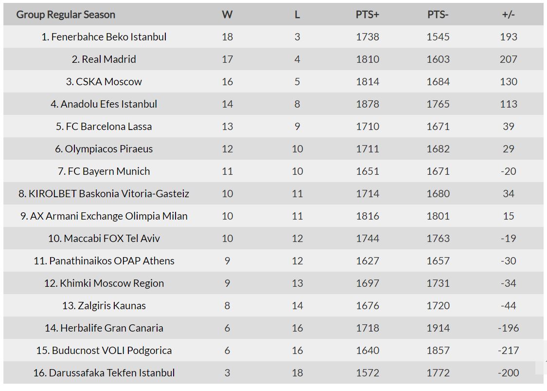 Δείτε πως διαμορφώθηκε η βαθμολογία της Ευρωλίγκας μετά τη διεξαγωγή του πρώτου μισού της 22ης αγωνιστικής.