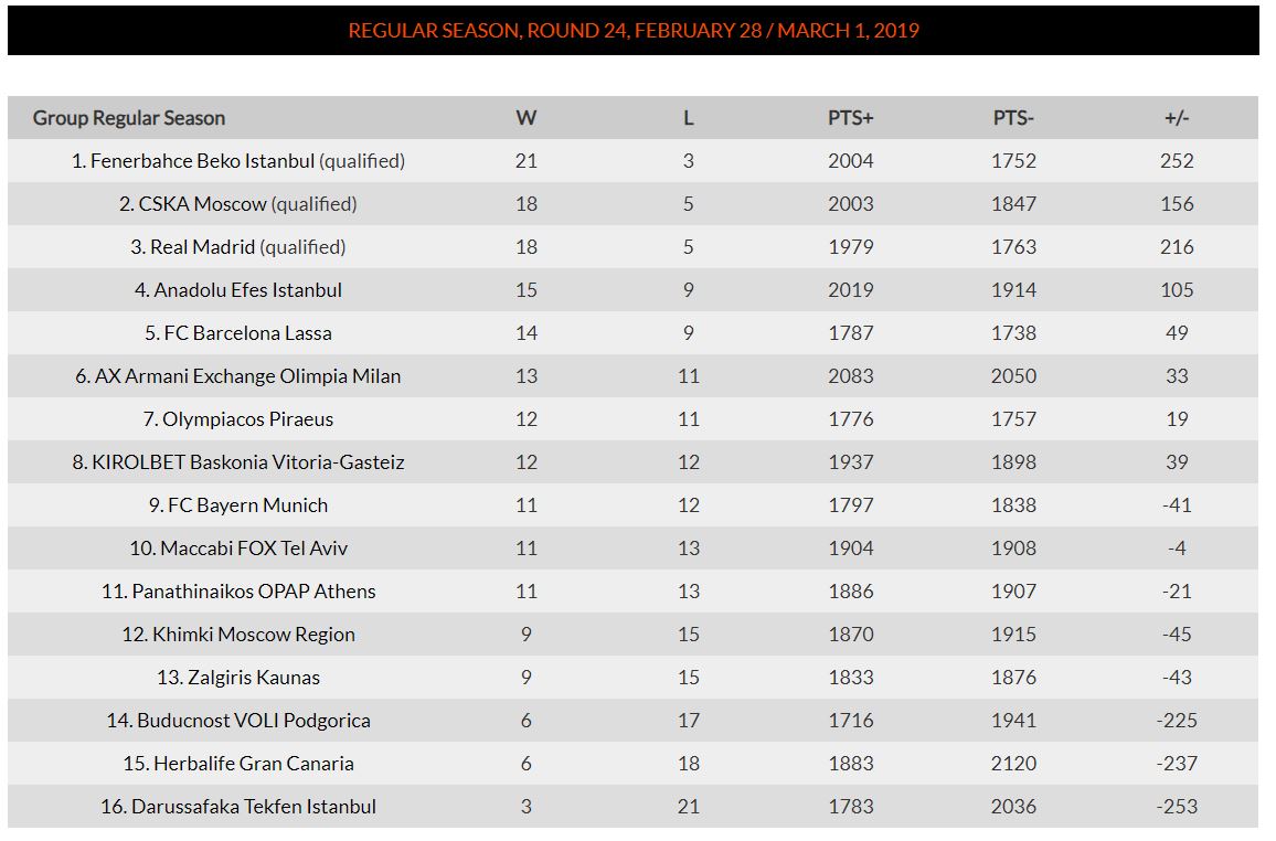 Με πέντε ματς άρχισε την Πέμπτη (28/2) η δράση στην 24η αγωνιστική της κανονικής περιόδου της Ευρωλίγκας.