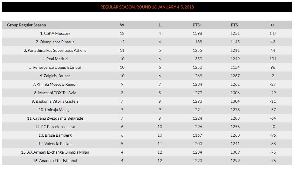 Η 16η αγωνιστική της Ευρωλίγκας ολοκληρώθηκε το βράδυ της Παρασκευής (5/1) με το δεύτερο μισό του προγράμματος. Η είδηση είναι ότι ο Ολυμπιακός ξανάπιασε κορυφή μετά την σχετικά εύκολη νίκη που πήρε επί της Αρμάνι Μιλάνο στο ΣΕΦ με 87-80.