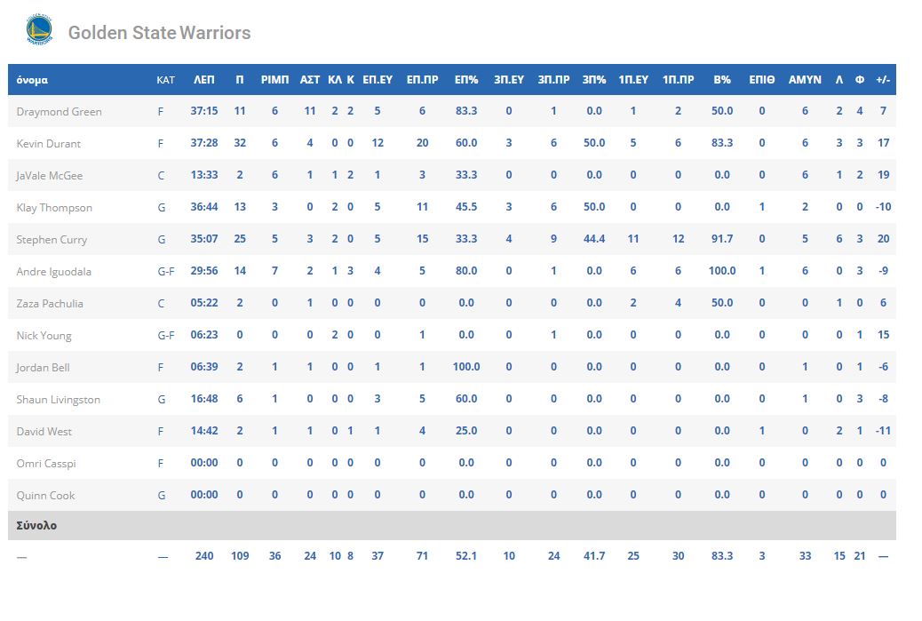 Πρώτος σκόρερ για τους νικητές ήταν ο Ντουράντ που σταμάτησε στους 32 πόντους και ακολούθησε ο Κάρι με 25, με τους δυο τους να είναι οι πρωταγωνιστές των πρωταθλητών. Για τους ηττημένους ο Πόρτερ είχε 29 πόντους και ο Ούμπρε 17 πόντους, όμως ο Μπιλ έμεινε μόλις στους 8 πόντους κι έτσι δεν ήρθε κάτι θετικό για τους «μάγους».