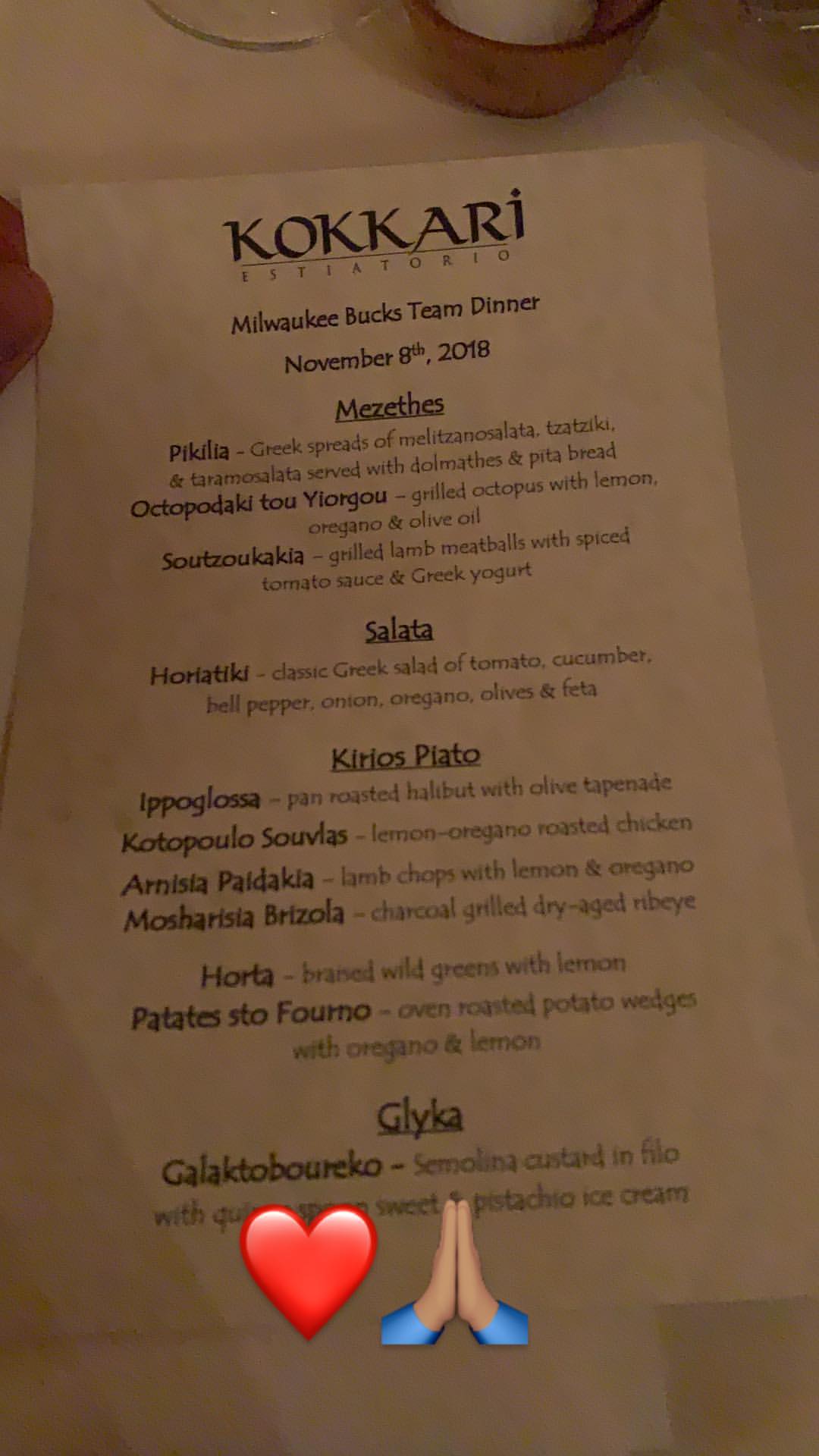 Μετά το ματς λοιπόν, η ομάδα του Μιλγουόκι, δείπνησε σε ελληνικό εστιατόριο του Σαν Φρανσίσκο με τον Γιάννη να μοιράζεται μέσω instagram με τους διαδικτυακούς του φίλους στιγμές από την βραδιά αλλά και το μενού του εστιατορίου με τους ελληνικούς μεζέδες και την χωριάτικη να ξεχωρίζουν σε άπταιστα… greeklish.