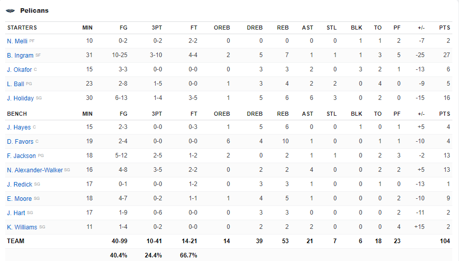 Για τους Πέλικανς ο Ίνγκραμ είχε 27 πόντους και ο Χόλιντεϊ 16.