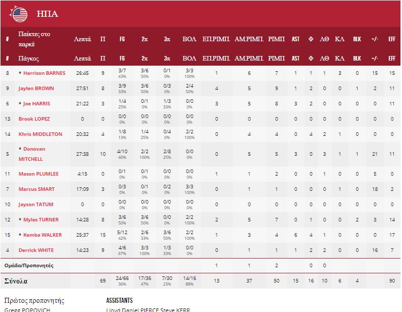 ΗΠΑ (Πόποβιτς): Μπαρνς 9 (7 ριμπάουντ), Μπράουν 8 (0/3 τρίποντα, 9 ριμπάουντ), Χάρις 3 (1/3 τρίποντα, 8 ριμπάουντ), Μίντλετον 4 (1/4 δίποντα, 0/4 τρίποντα, 2/2 βολές, 4 ριμπάουντ), Μίτσελ 10 (2/2 δίποντα, 2/8 τρίποντα, 5 ριμπάουντ, 3 ασίστ), Πλάμλι, Σμαρτ 3 (3/3 βολές), Τέρνερ 8 (3/6 δίποντα, 2/2 βολές, 7 ριμπάουντ), Γουόκερ 15 (2/6 δίποντα, 3/6 τρίποντα, 2/2 βολές, 4 ριμπάουντ, 6 ασίστ), Γουάιτ 9 (1).