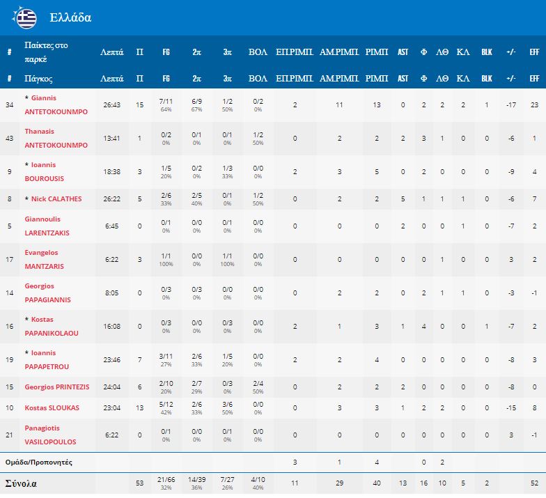 ΕΛΛΑΔΑ (Σκουρτόπουλος): Αντετοκούνμπο Γιάννης 15 (6/9 δίποντα, 1/2 τρίποντα, 0/2 βολές, 13 ριμπάουντ, 2 λάθη, 2 κλεψίματα και 1 τάπα σε 26’43»), Αντετοκούνμπο Θανάσης 1 (2 ριμπάουντ, 2 ασίστ), Μπουρούσης 3 (1/5 σουτ, 5 ριμπάουντ), Καλάθης 5 (2/5 δίποντα, 0/1 τρίποντο, 1/2 βολές, 5 ασίστ), Λαρεντζάκης (2 ασίστ), Μάντζαρης 3 (1), Παπαγιάννης (0/3 δίποντα), Παπανικολάου, Παπαπέτρου 7 (2/6 δίποντα, 1/5 τρίποντα, 4 ριμπάουντ), Πρίντεζης (2/7 δίποντα, 0/3 τρίποντα, 2/4 βολές), Σλούκας 13 (2/6 δίποντα, 3/6 τρίποντα, 3 ριμπάουντ), Βασιλόπουλος.