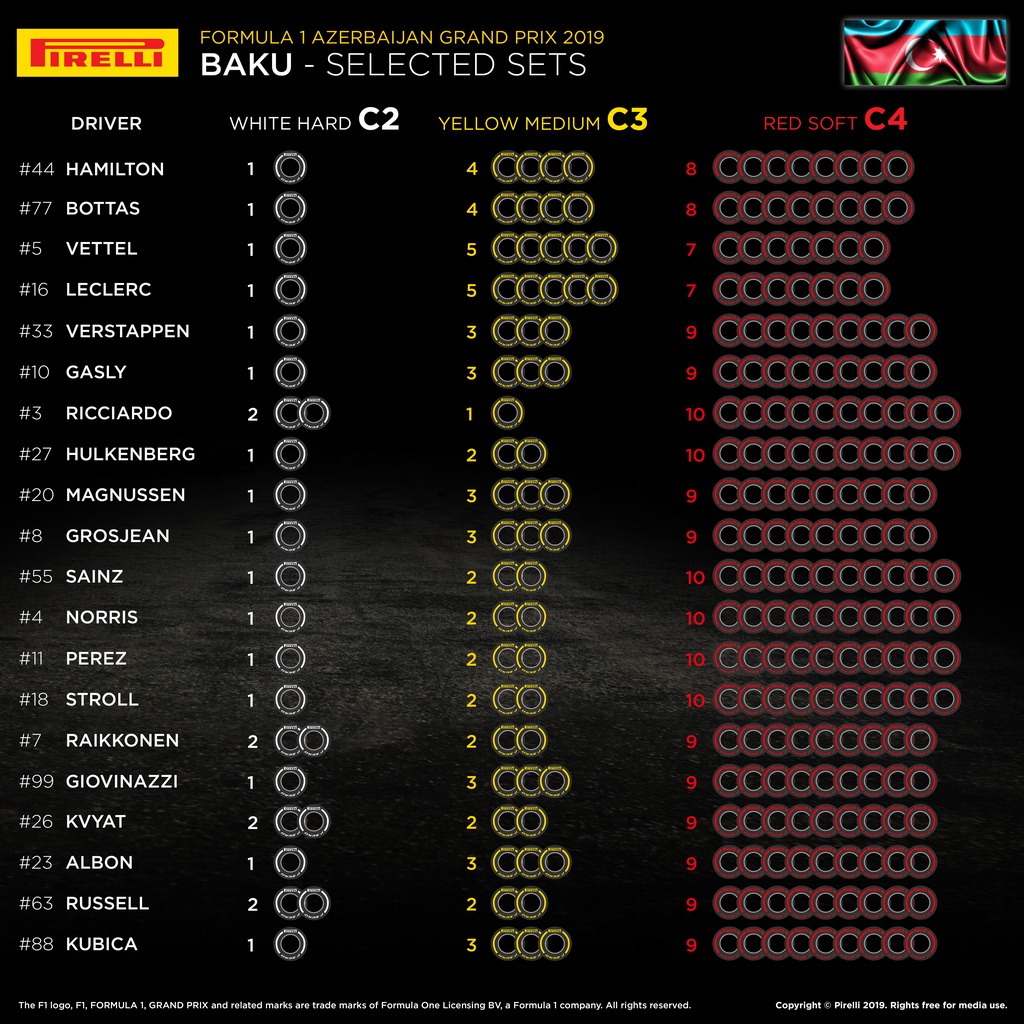 Στο Μπακού, στο Αζερμπαϊτζάν δίνεται η συνέχεια του παγκοσμίου πρωταθλήματος της Formula 1, με την Pirelli να προμηθεύει τις ομάδες με τη μεσαία γκάμα των γομών των ελαστικών της. Πρόκειται για τις C2 (σκληρή), C3 (μέση) και C4 (μαλακή), γόμες που χρησιμοποιήθηκαν και στην Κίνα.