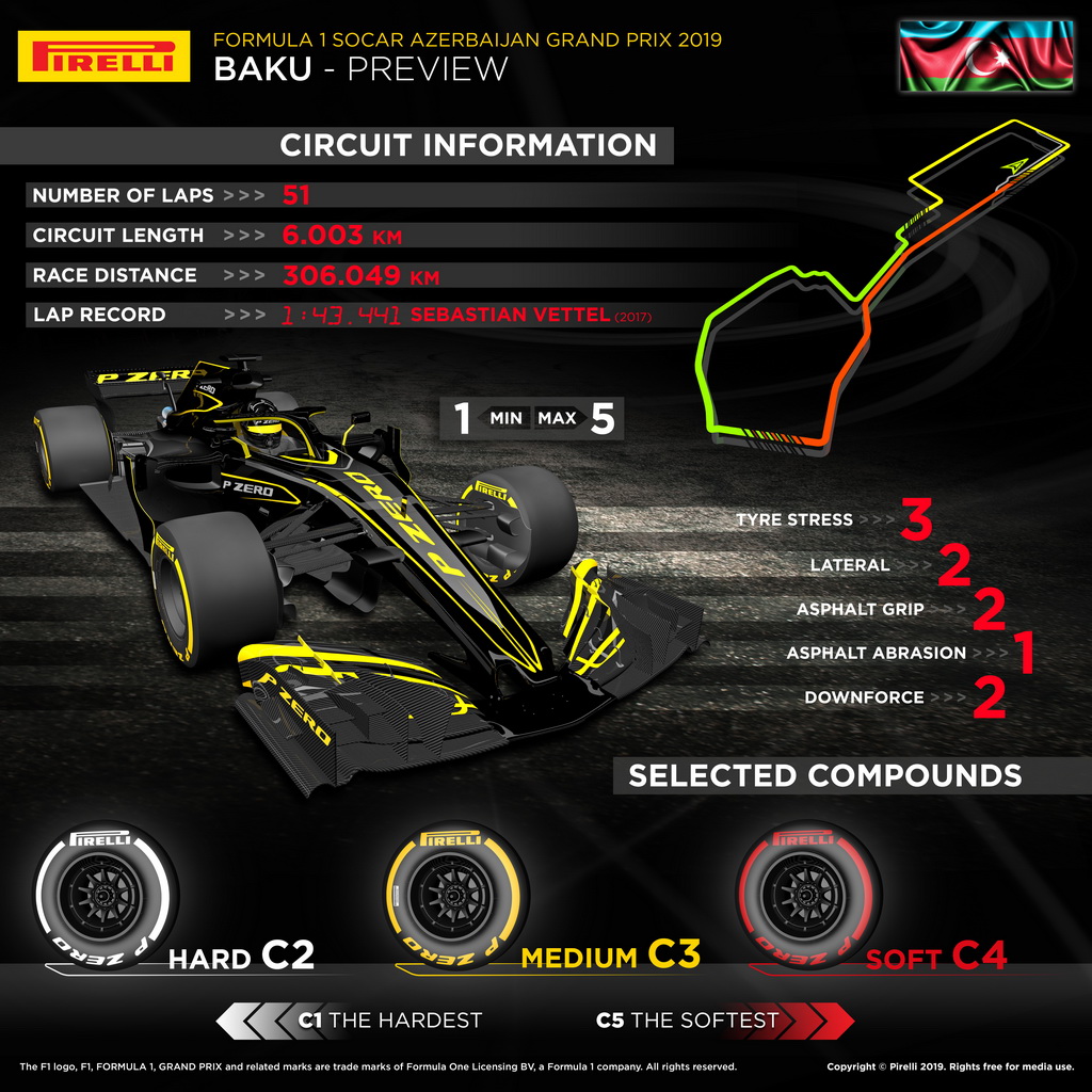 Η συνέχεια του παγκοσμίου πρωταθλήματος της Formula 1 δίνεται το Πάσχα στην πίστα του Μπακού, με την Pirelli να προμηθεύει τις ομάδες με τις γόμες C2, C3 και C4.