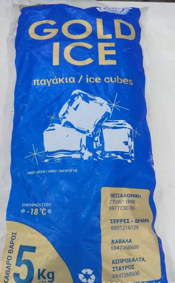 Παγάκια συσκευασμένα GOLD ICE, σε κλειστή πλαστική συσκευασία 5 κιλών, με ημερομηνία παραγωγής 24-09-2020 και ημερομηνία λήξης 24-10-2021, το οποίο παράγεται από την επιχείρηση ΤΣΕΡΤΣΕΝΕΣ ΓΕΩ. ΕΥΑΓΓΕΛΟΣ, ΑΣΣΗΡΟΣ (ΔΗΜΟΥ ΛΑΓΚΑΔΑ) ΘΕΣΣΑΛΟΝΙΚΗΣ και διανέμεται από την επιχείρηση ΠΑΠΑΖΟΓΛΟΥ ΔΗΜ. ΖΗΝΟΒΙΑ, Περιοχή Παραλίμνιο Σερρών.