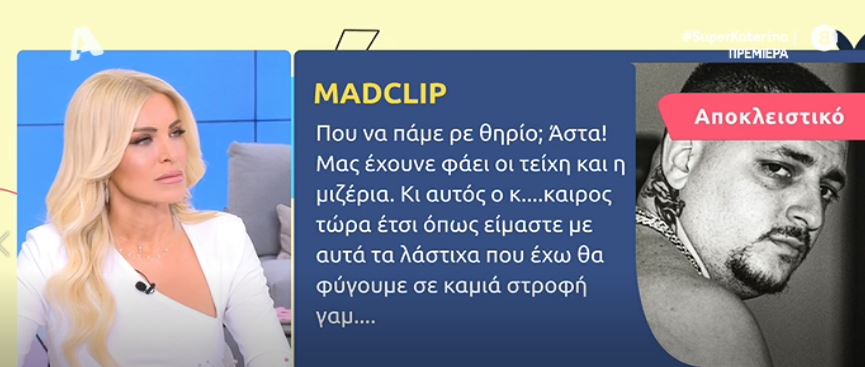 «Που να πάμε ρε θηρίο; Άστα! Μας έχουν φάει οι τοίχοι και η μιζέρια. Και αυτός ο κ@λ@καιρος έτσι όπως είμαστε με αυτά τα λάστιχα που έχω θα φύγω σε καμιά στροφή γαμ@το» ακούγεται να λέει ο Mad Clip στο ηχητικό ντοκουμέντο.
