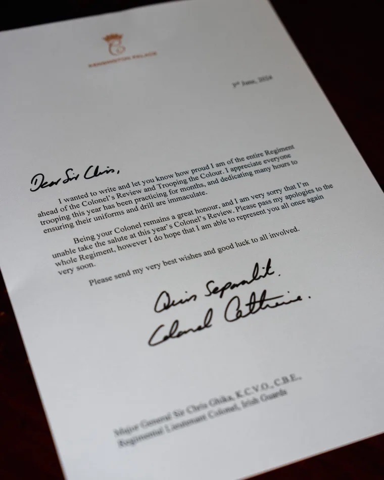 Η Κέιτ Μίντλετον, σε απολογητική επιστολή προς την επιθεώρηση της Ιρλανδικής Φρουράς, ζήτησε συγγνώμη για την απουσία της και επιβεβαίωσε ότι δεν θα παραστεί στη μεγάλη γιορτή της βασιλικής οικογένειας και στο μπαλκόνι του Μπάκιγχαμ.