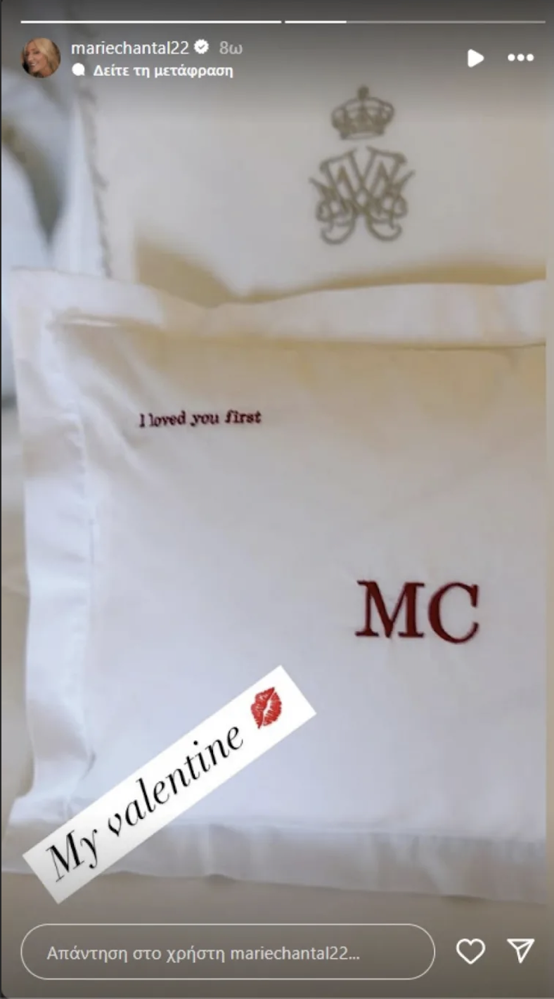 Σε δεύτερο story, δημοσίευσε μια φωτογραφία από το κρεβάτι της, όπου φαίνεται μια μαξιλαροθήκη με ένα ρομαντικό μήνυμα:«Σε αγάπησα πρώτος»