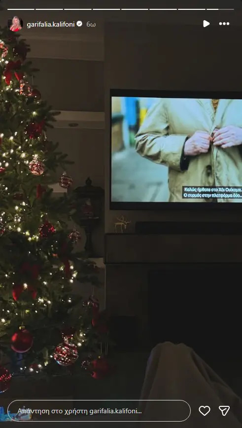 Το βράδυ της Τρίτης 25 Νοεμβρίου, η Γαρυφαλλιά Καληφώνη ανάρτησε story στα social media, παρουσιάζοντας το πλούσια στολισμένο χριστουγεννιάτικο δέντρο τους, το οποίο κυριαρχούσαν οι κόκκινες μπάλες, οι χρυσές λεπτομέρειες, οι κορδέλες και τα φωτάκια, δημιουργώντας μια cozy και ρομαντική εικόνα για χαλαρές στιγμές στο σπίτι. Δίπλα στο δέντρο, η τηλεόραση πρόβαλλε ταινία ή σειρά, ενισχύοντας ακόμα περισσότερο το αίσθημα θαλπωρής.