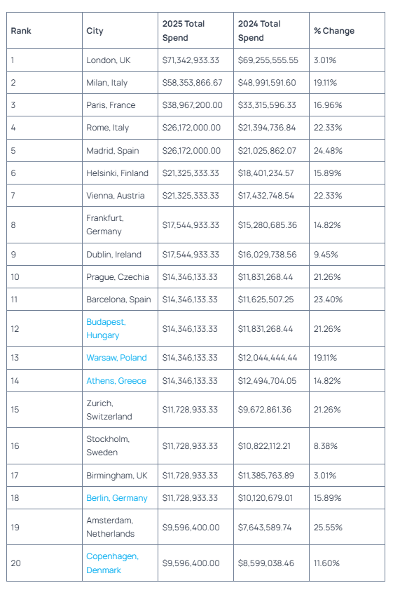 Σε επίπεδο συνολικής δαπάνης πόλεων, το Λονδίνο παραμένει η οικονομική «άγκυρα» με 65,6 εκατομμύρια Ευρώ όμως η Ρώμη και η Μαδρίτη ανεβαίνουν ραγδαία με ρυθμούς ανάπτυξης 22%-24%.