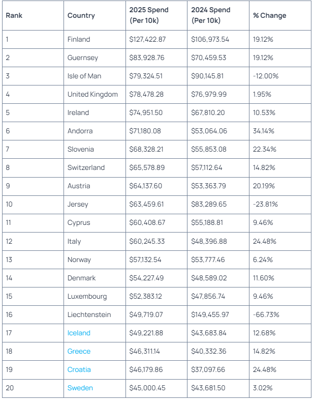 Η Φινλανδία διατηρεί το στέμμα της ως η χώρα με τη μεγαλύτερη κατά κεφαλήν δαπάνη παγκοσμίως, ενώ η Ιταλία και η Ισπανία καταγράφουν εκρηκτική αύξηση 25% στη συνολική δαπάνη.
