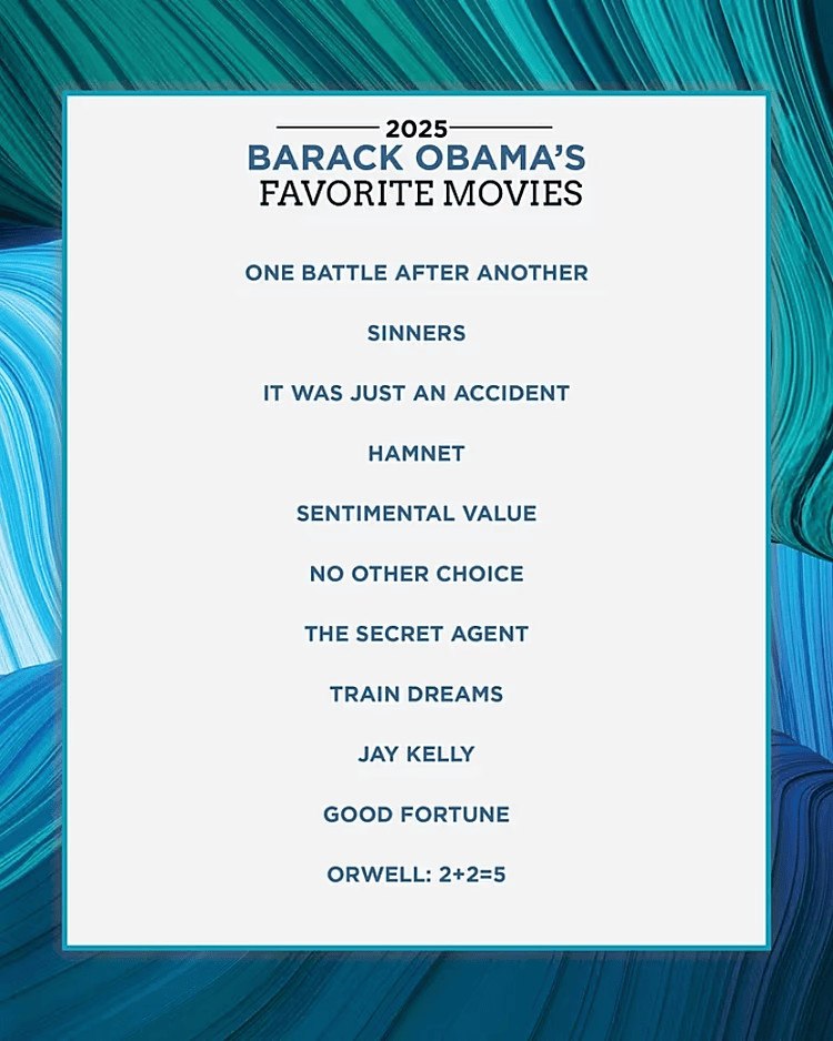 Oι επιλογές του Ομπάμα από τις παραγωγές που γέμισαν τις σκοτεινές αίθουσες και έκαναν buzz, περιλαμβάνουν το One Battle After Another του Πολ Τόμας Άντερσον, το It Was Just An Accident του Τζαφάρ Παναχί και το δράμα τρόμου Sinners του Ράιαν Κούγκλερ -την αλληγορία για την αποικιοκρατία και τη μαύρη ταυτότητα στις ΗΠΑ με αιμοδιψείς βρυκόλακες- επιβεβαιώνοντας την προτίμηση του σε δημιουργούς που τολμούν να καταπιαστούν με σύνθετα κοινωνικά και πολιτικά ζητήματα.