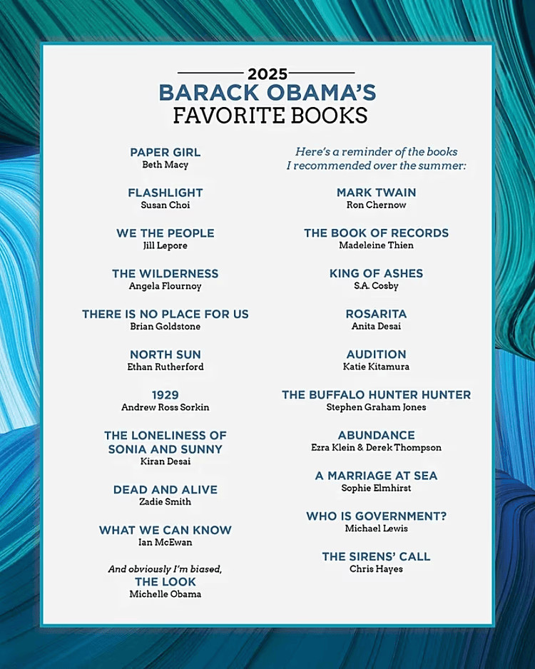 «Όσο το 2025 πλησιάζει στο τέλος του, συνεχίζω μία παράδοση, που ξεκίνησα από τη θητεία μου στον Λευκό Οίκο: το να μοιράζομαι την ετήσια λίστα με τα αγαπημένα μου βιβλία, ταινίες και τραγούδια. Ελπίζω να βρείτε κάτι καινούργιο, για να το απολαύσετε – και παρακαλώ, στείλτε μου προτάσεις για να τις δω κι εγώ», σημείωσε.
