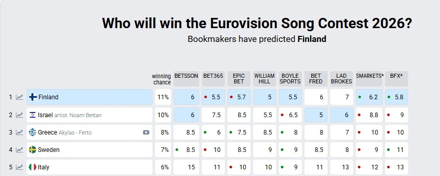 Είναι η πρώτη φορά μετά τη νίκη της Ελλάδας το 2005 που η χώρα συζητιέται τόσο έντονα και με τόσο απτό τρόπο, μέσα από τα στοιχήματα και τα διεθνή charts προσδοκιών. Στην 1η θέση των αποδόσεων βρίσκεται αυτή τη στιγμή η Φινλανδία, παρότι το τραγούδι της δεν έχει ακόμη κυκλοφορήσει επισήμως, ενώ στη 2η θέση κατατάσσεται το Ισραήλ.