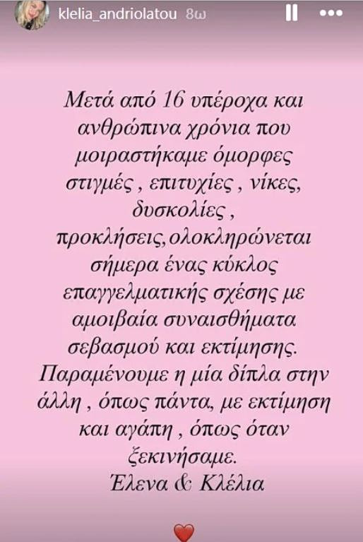 Παραμένουμε η μία δίπλα στην άλλη, όπως πάντα, με εκτίμηση και αγάπη, όπως όταν ξεκινήσαμε. Έλενα & Κλέλια».