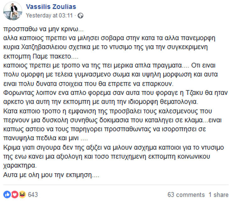 «Προσπαθώ να μην κρίνω…αλλά κάποιος πρέπει να μιλήσει σοβαρά στην κατά τα άλλα πανέμορφη κυρία Χατζηβασιλείου σχετικά με το ντύσιμό της για την συγκεκριμένη εκπομπή «Πάμε πακέτο»…. Κάποιος πρέπει με τρόπο να της πει μερικά απλά πράγματα…. Ότι είναι πολύ όμορφη με τέλεια γυμνασμένο σώμα και υψηλή μόρφωση και αυτά είναι πολύ δυνατά στοιχεία που θα έπρεπε να επαρκούν. Φορώντας λοιπόν ένα απλό φόρεμα σαν αυτά που φόραγε η Τζάκυ θα ήταν αρκετό για αυτή την εκπομπή με αυτή την ιδιόμορφη θεματολογία. Κατά κάποιο τρόπο η εμφάνισή της προσβάλλει τους καλεσμένους που περνούν μια δύσκολη –συνήθως- δοκιμασία που καταλήγει σε κλάμα… Είναι κάπως αστείο να τους παρηγορεί προσπαθώντας να ισορροπήσει σε πανύψηλα πέδιλα και μίνι …. Κρίμα γιατί σίγουρα δεν της αξίζει να μιλούν άσχημα κάποιοι για το ντύσιμό της ενώ κάνει μια αξιόλογη και τόσο πετυχημένη εκπομπή κοινωνικού χαρακτήρα. Αυτά με όλη μου την εκτίμηση…».