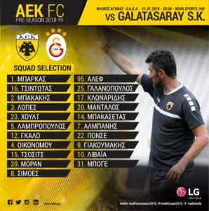 Οι εκλεκτοί του προπονητή της ΑΕΚ είναι οι Μπάρκας, Τσιντώτας, Μπακάκης, Γκάλο, Λόπες, Χουλτ, Λαμπρόπουλος, Τσόσιτς, Οικονόμου, Σιμόες, Γαλανόπουλος, Μοράν, Άλεφ, Μάνταλος, Μπακασέτας, Μπογιέ, Αλμπάνης, Κλωναρίδης, Γιακουμάκης, Λιβάια, Πόνσε.