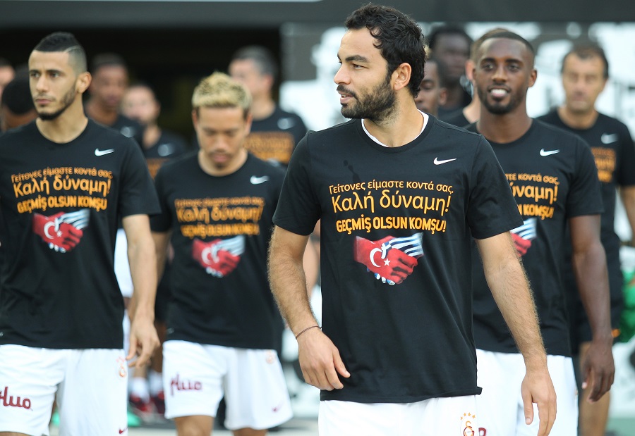 Οι ποδοσφαιριστές της Γαλατά έκαναν προθέρμανση με t-shirt που γράφουν «Γείτονες είμαστε κοντά σας, καλή δύναμη!» και έχουν δύο χέρια με ελληνική και τουρκική σημαία να είναι μαζί, ενώ είναι γραμμένο και στις δύο γλώσσες.