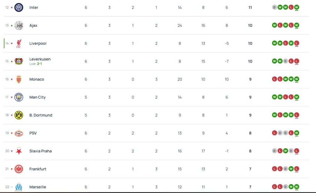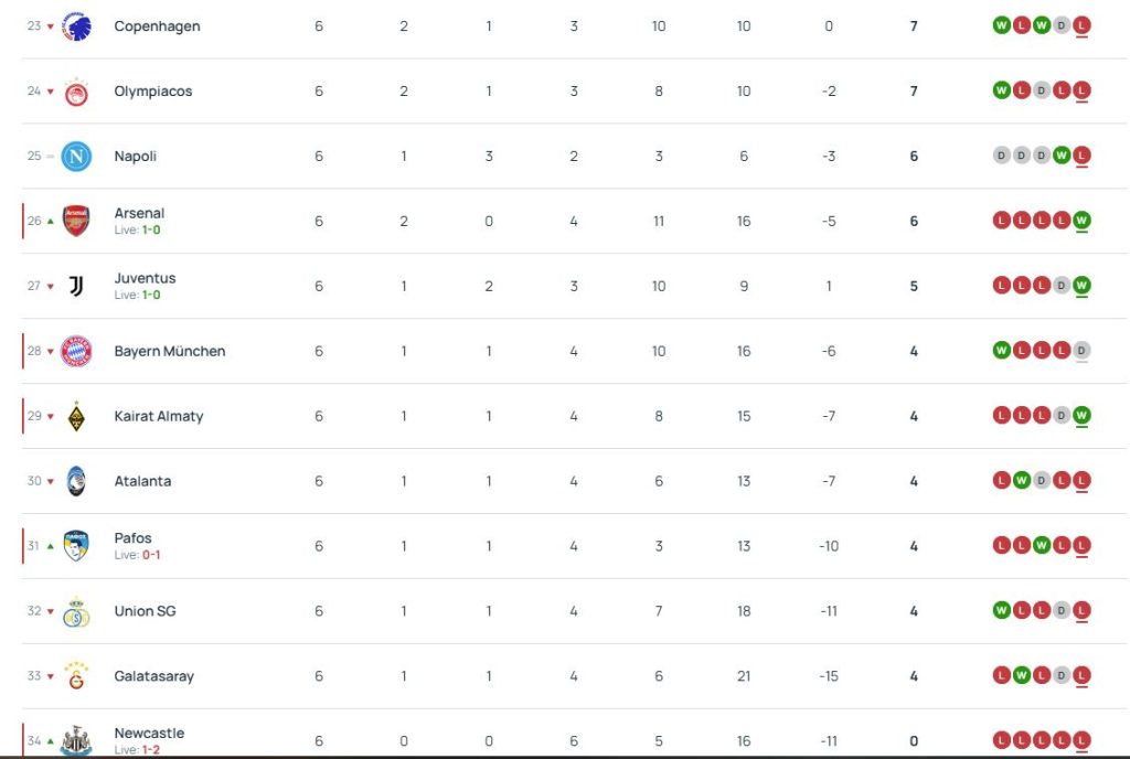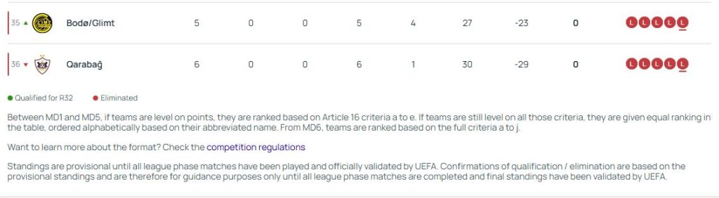 Ο Ολυμπιακός τερμάτισε στην 24η θέση με 22 ομάδες να προκρίνονται και τις Μαρσέιγ και Άιντραχτ Φρανκούφτης που ήταν από πάνω του να περνούν στην επόμενη φάση, έχοντας συγκεντρώσει 7 βαθμούς.