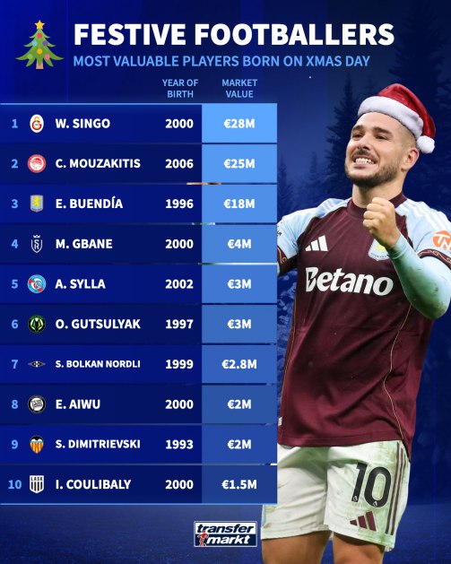 Με αφορμή τη διακοπή των περισσότερων πρωταθλημάτων για τις γιορτές, τα περισσότερα ΜΜΕ του εξωτερικού καλύπτουν την επικαιρότητα με θέματα εορταστικού χαρακτήρα. Σε ένα από αυτά λοιπόν, το γνωστό transfermarkt έψαξε και βρήκε τους ποδοσφαιριστές με γενέθλια ανήμερα των Χριστουγέννων και φυσικά τα συνδύασε με την λεγόμενη «χρηματιστηριακή αξία» τους, αντικείμενο με το οποίο άλλωστε ειδικεύεται η εν λόγω ιστοσελίδα.