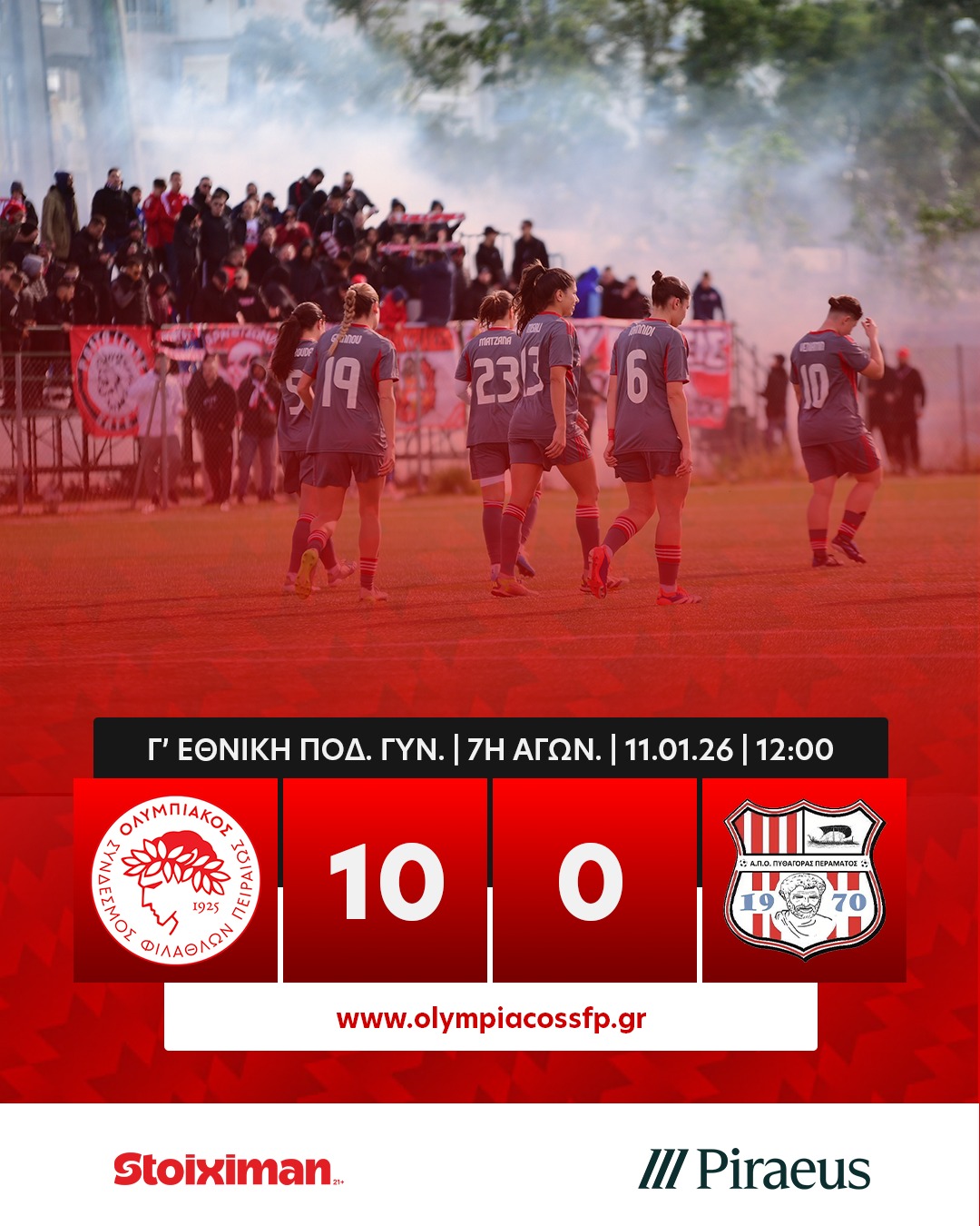 Ο Ολυμπιακός στην πρεμιέρα του στη Γ’ Εθνική στις 12 Οκτωβρίου έπαιξε κόντρα στον Εθνικό Καλαμάτας και επικράτησε με 10-0! Το μεγαλειώδες νικηφόρο σερί συνεχίζεται μέχρι σήμερα, αφού οι Ερυθρόλευκες δεν έχουν δεχτεί κανένα γκολ έως τώρα και σκοράρουν ασταμάτητα, το κοντέρ γράφει ήδη 91 γκολ, ενώ και στο πιο πρόσφατο ματς οι παίκτριες της ομάδας του μεγάλου λιμανιού νίκησαν με 0-10 την Διεθνή Ακαδημία 3Β ΑΣ στο Δημοτικό στάδιο Βάρης, για το ματς της 9ης αγωνιστικής.