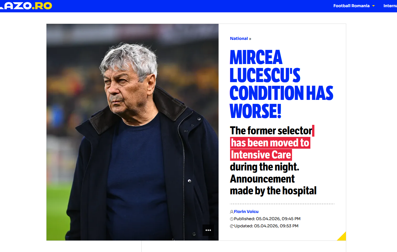 Η κατάσταση της υγείας του Μιρτσέα Λουτσέσκου μετά την καρδιακή προσβολή που υπέστη πριν μερικά 24ωρα χειροτέρεψε και μεταφέρθηκε στην εντατική - Η ανακοίνωση του νοσοκομείου
