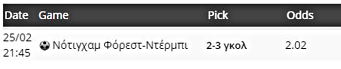 Το Χ χαρακτηρίζει το συγκεκριμένο ντέρμπι, ισόπαλα τα 3 στα 4 τελευταία με γηπεδούχο τη Φόρεστ, 0-0 αυτό του α’ γύρου στα μέσα Δεκέμβρη, συμπτωματικά είχε διεξαχθεί κι αυτό βράδυ Δευτέρας. Η Φόρεστ έχει σαφέστατο προβάδισμα αυτή τη φορά, όχι μόνο γιατί Μάρτιν Ο’Νιλ στον πάγκο, αλλά και γιατί υπάρχει κόπωση στη Ντέρμπι, ο Λάμπαρντ έβαλε πολλούς βασικούς στα δύο κύπελλα με τα «κριάρια» να προχωρούν αρκετά φέτος. Ο άσος είναι πολύ δυνατός στο 2.55, πρόκειται όμως για πολύ μεγάλο ντέρμπι με αρκετές ιδιαιτερότητες. Αναμένεται σκληρό και κλειστό, δύσκολα όμως θα λείξει χωρίς σκορ. Στο 2.02 τα …κλασικά πια 2-3 γκολ έχουν πολλές πιθανότητες.