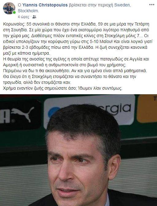 «Κορωναϊός: 55 συνολικά οι θάνατοι στην Ελλάδα, 59 σε μια μέρα την Τετάρτη στη Σουηδία. Σε μία χώρα που έχει ένα εκατομμύριο λιγότερο πληθυσμό από την χώρα μας. Διαθέσιμες πλέον εντατικές κλίνες στη Στοκχόλμη μόλις 7… Οι ειδικοί υπολογίζουν την κορύφωση γύρω στις 5-10 Μαΐου! Και είναι λογικό γιατί βρίσκεται 2-3 εβδομάδες πίσω από την Ελλάδα. Η ζωή συνεχίζεται κανονικά μαζί με κάποια ημίμετρα.