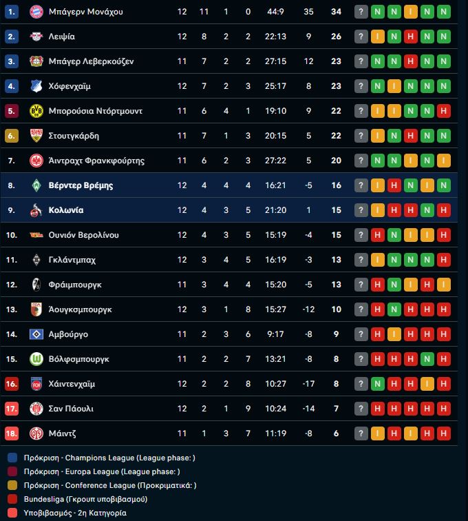 Στη Βρέμη η Βέρντερ ήρθε ισόπαλη με 1-1 απέναντι στην Κολωνία με τον Φρεντλ να κάνει το 1-0 στο 22′, με τον Μάλα να ισοφαρίζει για τους φιλοξενούμενους με τον Μάλα στο 90+1.