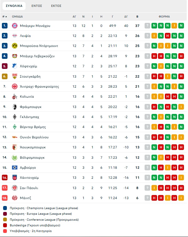 Η βαθμολογία της Bundesliga σε 13 αγωνιστικές
