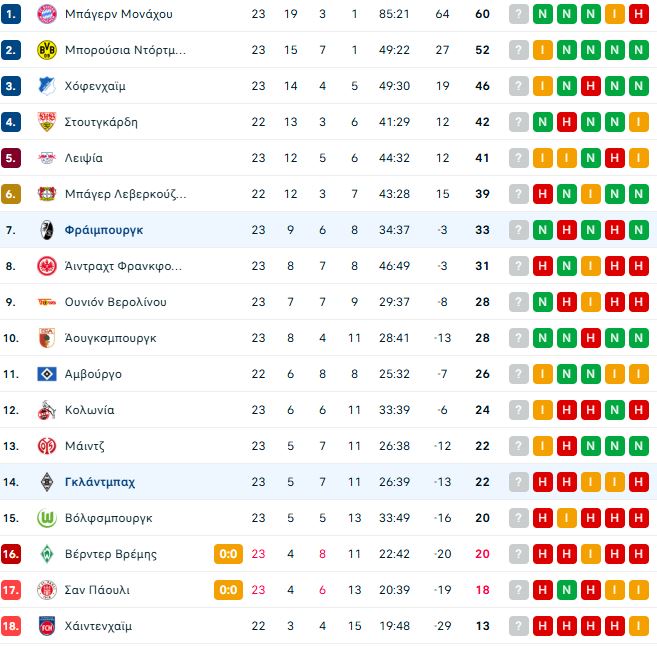 Αξίζει να σημειωθεί ότι η Φράιμπουργκ βρίσκεται στην 7η θέση της Bundesliga με 33 βαθμούς, ενώ η Γκλάντμπαχ φιγουράρει στην 14η του βαθμολογικού πίνακα του γερμανικού πρωταθλήματος, έχοντας 22 βαθμούς.