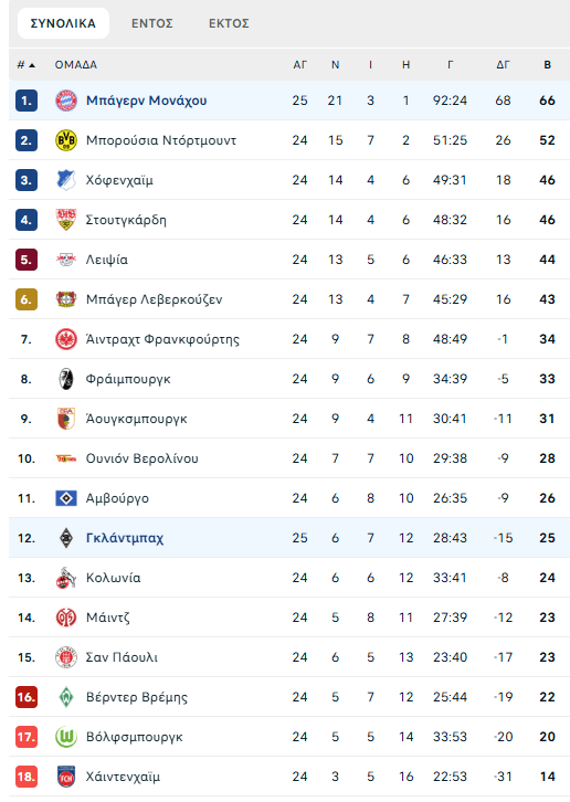 Η Μπάγερν έφτασετους 66 βαθμούς και βρίσκεται πλέον στο +14 από τη δεύτερη Ντόρτμουντ, έχοντας παιχνίδι παραπάνω. Στους 25 βαθμούς έμεινε η Γκλάντμπαχ, η οποία βρίσκεται μόλις πέντε βαθμούς από την επικίνδυνη ζώνη.