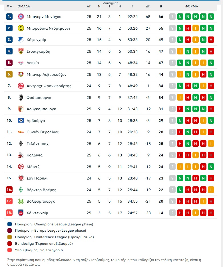 H βαθμολογία της Bundesliga σε 25 αγωνιστικές